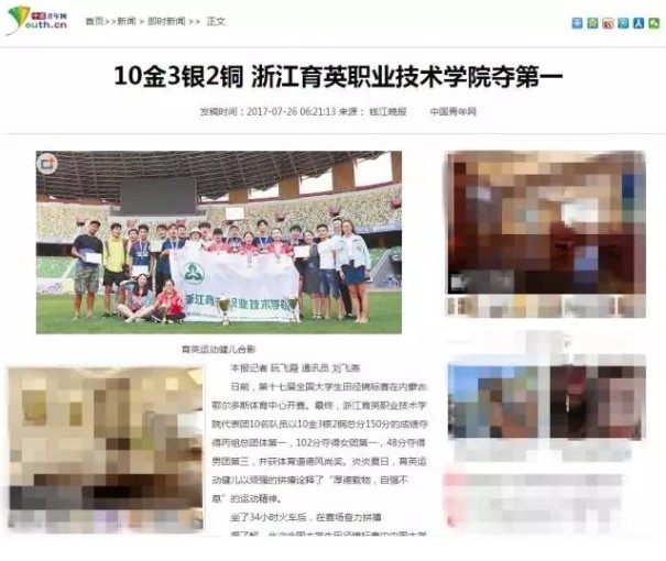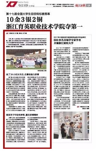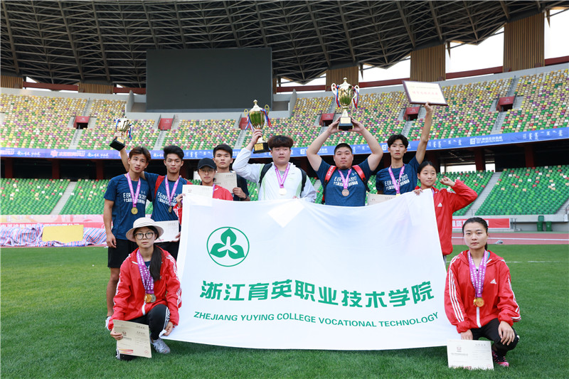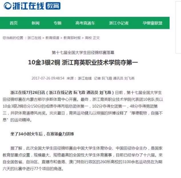 7月15日-20日,第十七届全国大学生田径锦标赛在内蒙古鄂尔多斯体育中心举行,浙江育英职业技术学院代表团10名队员,以10金3银2铜总分150分的成绩,夺得丙组(非专业组)团体总分第一,此外还获得女团第一,男团第三,并获体育道德风尚奖。同学们用拼搏精神和成绩,诠释了“厚德载物、自强不息”的育英精神。如此佳绩,引起媒体广泛关注。《都市快报》、《钱江晚报》、中国青年网、浙江在线等媒体报道转载了我院出色的体育成果。