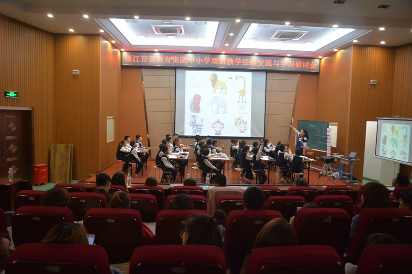 下午1:30会议继续进行,与会人员在阶梯教室现场观摩双语教学。此节课由温州育英双语班英语老师熊菲执教,师生扮演动物角色中,让孩子们在具体生动的情境中快乐学习英语,课堂气氛活跃,教学效果显著,赢得专家和老师们的一致好评。