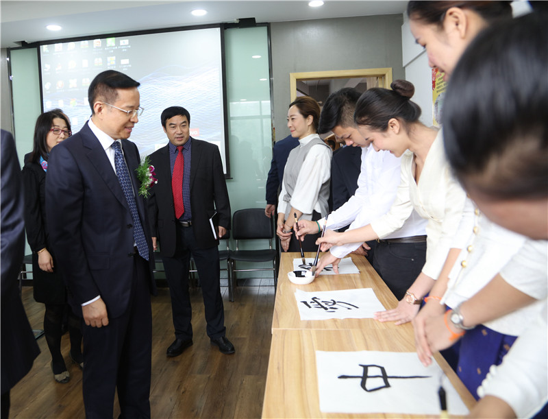 2016级老挝留学生班任课教师王彤、2016级老挝留学生陆娅、2017级老挝留学生Billy分别作为教师、老生和新生代表发言,并由老挝留学生薇拉娅、唐糖担任王彤和Billy的汉语翻译,陆娅用汉语和老挝语双语发言。老挝教育代表团随团翻译通萨多次对2016级老挝留学生的中文发言和翻译表示肯定和赞赏。本朋副司长一行还观看了2016级老挝留学生的专业技能展示、传统文化展示、中文导游词讲解。看到汉语零基础入学的首届老挝留学生们经过一年的学习取得巨大进步,能够流利的中文解说和翻译,本朋一行十分欣慰,赞不绝口。
