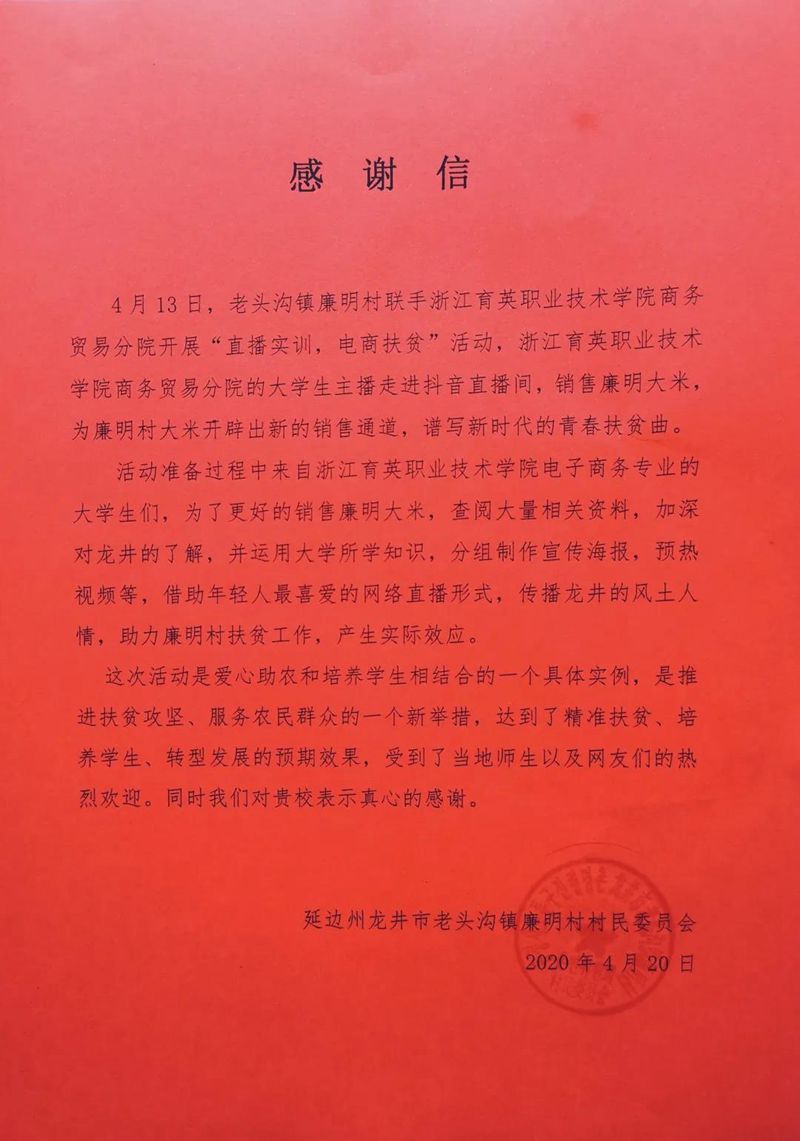 2020年4月13日至4月17日,浙江育英职业技术学院商务贸易分院在获阿里巴巴中小企业商学院认证的学生中选拔的5位优秀校园主播,经过专题培训后正式开播。五位校园主播轮番上场,参与电商扶贫项目,对吉林省延边朝鲜族自治州龙井市老头沟镇廉明村生产的大米进行多种形式的推荐。