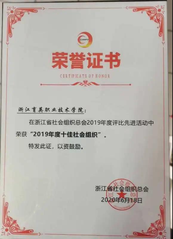 2020年7月16日,浙江省社会组织总会召开2019年度评比先进表彰大会,浙江育英职业技术学院被评为2019年度“十佳社会组织”。