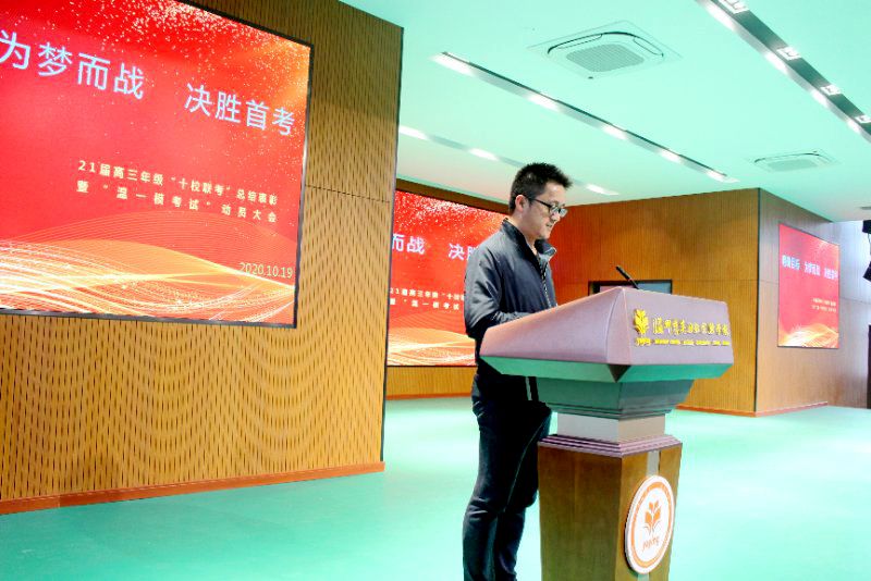 长风烈烈战鼓催,旌旗飞扬马蹄碎。为了增强2021届高三学子迎战高考首考的信心,激发学生们努力拼搏、勤学苦练的精神,使学生们能以良好的心态、坚定的目标、昂扬的斗志、必胜的信念投入到紧张的高三学习复习中。10月19日,温州育英国际实验学校举行了“明确目标,为梦而战,决胜首考”高考励志动员大会。学校高中部领导及2021届高三年级全体师生参加了动员会。教务处副主任黄旺秋老师作为大会组织者和主持人全程策划并主持了大会。