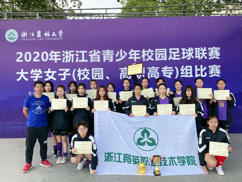 2020年10月16-22日,2020年浙江省青少年校园足球联赛大学女子(校园、高职高专)组比赛在浙江临安举行。浙江育英职业技术学院女足努力拼搏,以3胜2平的战绩勇夺亚军。领队季勋龙,主教练金海伟。