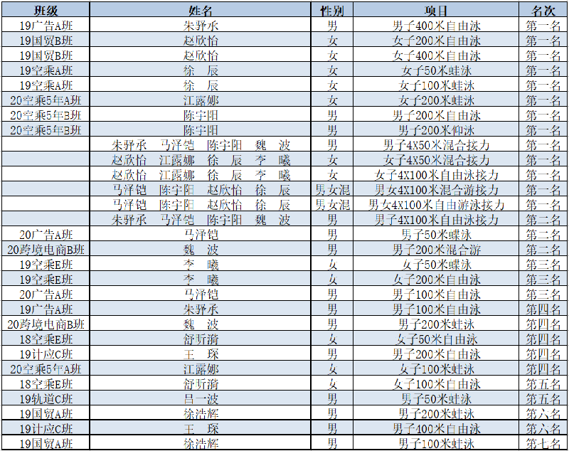 很荣幸,我在这次比赛中一共拿了六块金牌。回想备赛的两个月,当我们得知比赛的消息,全员立刻进入备战状态。根据自己的比赛项目,制订了不同的训练计划,并进行了针对性的训练。将近两个月的高强度训练,队员们都坚持到最后。训练过程中一次次重游,即使再累,大家也都有一股向前冲的劲。感谢学院领导和教练给我们提供了平台,也要感谢我的队友们一直在为我加油,给足了我上场比赛的信心和勇气。
