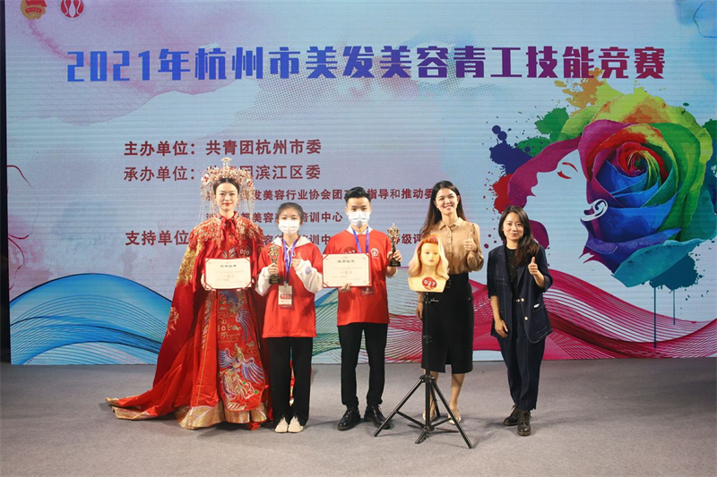 2021杭州市美容美发青工技能竞赛由共青团杭州市委主办,浙江育英职业技术学院创意设计分院20级形象B班沈纯伊获青工组新娘妆比赛一等奖。指导老师张家闲、沈思冰。