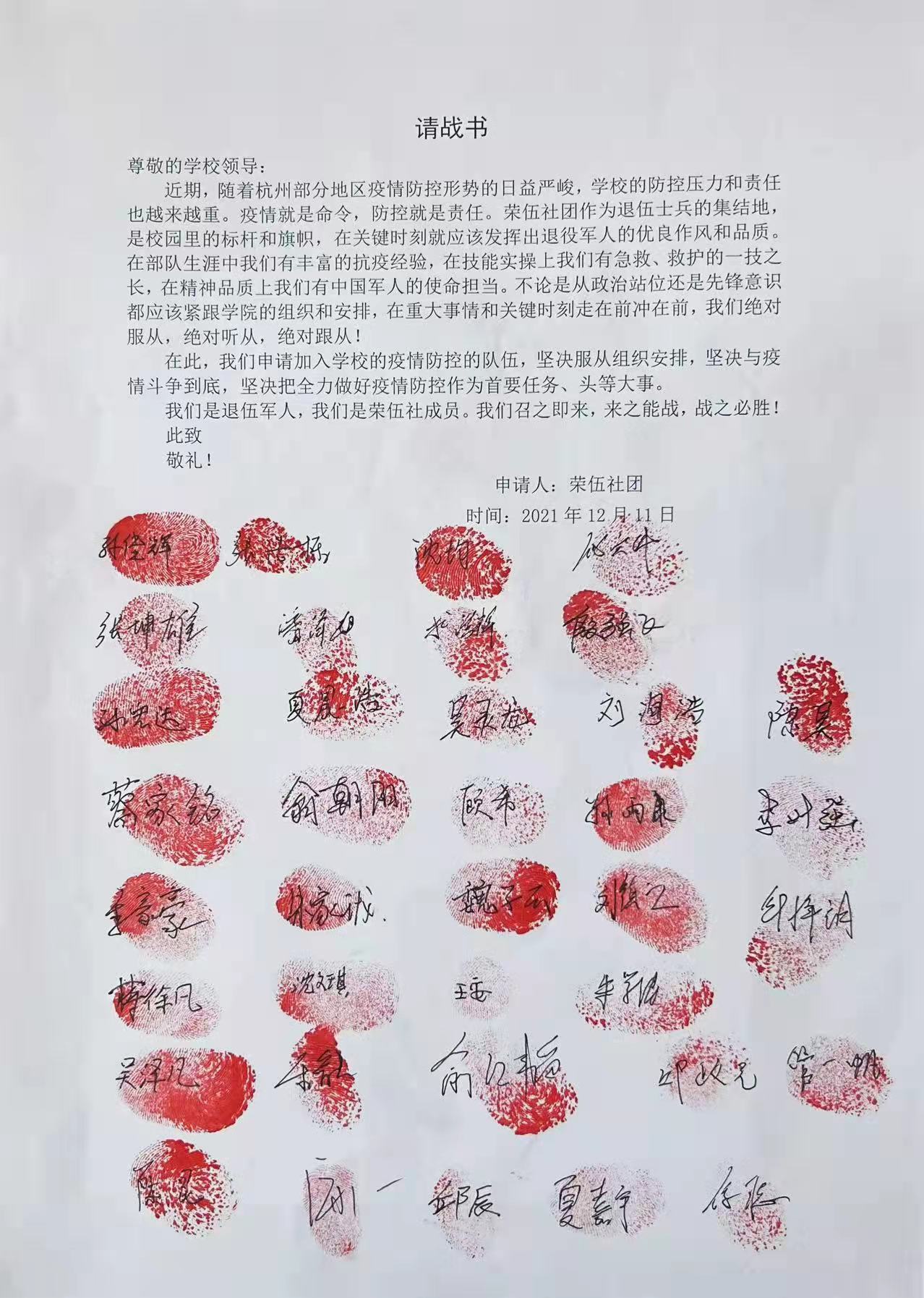 “我们申请加入学校疫情防控的队伍,坚决服从组织安排,坚决与疫情斗争到底,坚决把全力做好疫情防控作为首要任务、头等大事。”一封特殊的“请战书”引发了浙江育英职业技术学院师生的关注。一张普通的信笺纸上,37个亲笔签名和鲜红的手印格外耀眼,话语铿锵有力,情绪激昂坚定,书写者以最质朴的方式传达出抗击疫情的热情和决心。