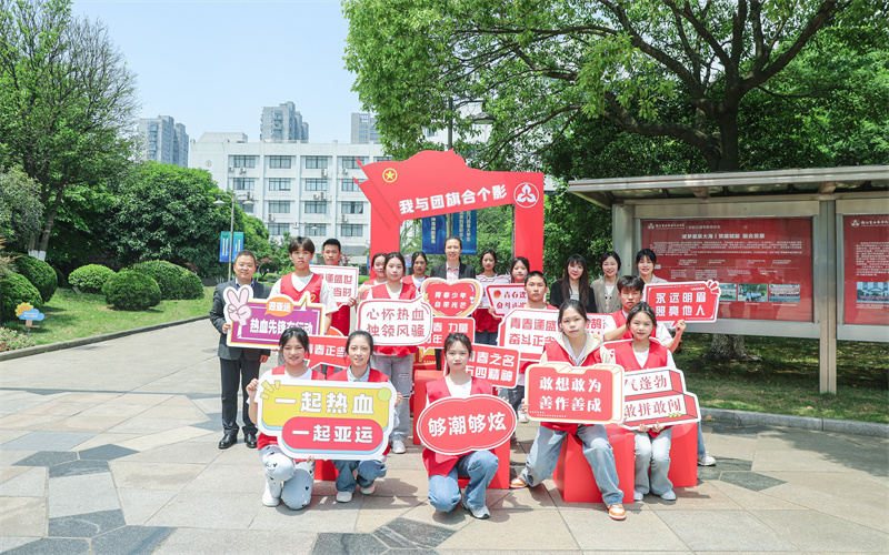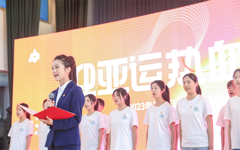 浙江育英职业技术学院青年志愿者代表带领青年志愿者们共同发起“迎亚运热血先锋在行动”的倡议。