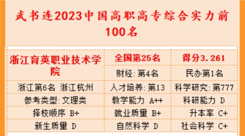 5月31日,武书连2023中国高职高专评价排行榜发布。浙江育英职业技术学院综合实力位列全国高职院校第25名,浙江省高职院校第6名,全国民办高职第1名,全国财经类高职第4名,浙江育英职业技术学院人才培养位列全国高职院校第13名。