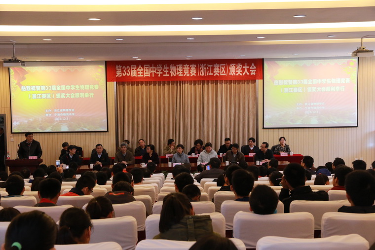 2016年12月3日上午,第33届全国中学生物理竞赛(浙江赛区) 颁奖大会在镇海中学隆重举行。省科协青少年科技活动中心主任杨英,镇海区副区长刘立群,区教育局副局长贺军辉,浙江省物理学会理事长、浙江大学物理系教授鲍世宁,浙江省中学生物理竞赛委员会主任、浙江大学物理系教授盛正卯,全国中学生物理竞赛委员会常委、浙江省物理学会副秘书长潘正权,浙江省物理学会秘书长、浙江大学物理系教授应和平和浙江大学物理系教授李海洋,复旦大学教授宁波招生组组长陆起涌、数学科学学院副院长楼卫东和物理教学实验中心副主任赵在忠,省教研室梁旭、周彩莺,市教研室董克剑及我省获奖师生与会。大会由董克剑老师主持。
